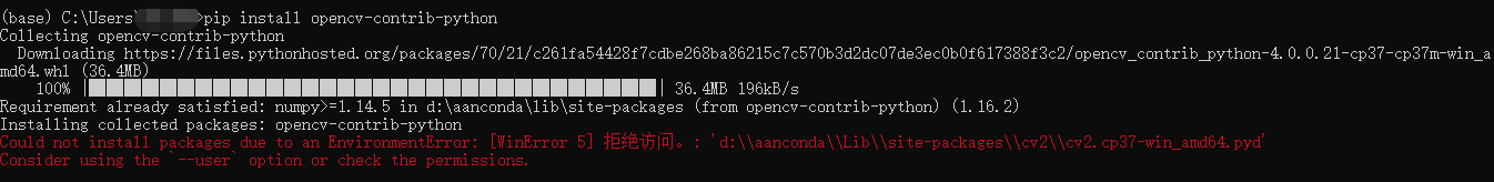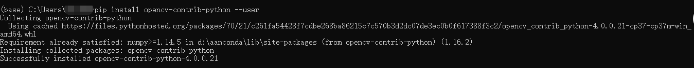 打开anaconda prompt(安装anaconda 会默认安装),输入pip install opencv-contrib-python,如下: