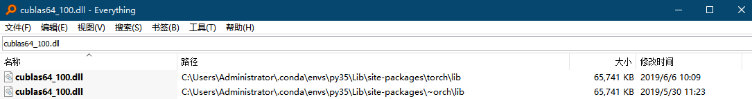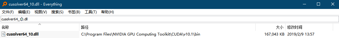 发现不在C:/windows/system32文件夹下,但是在其他很多文件夹中存在这个文件,然后我就按博客所说的,将搜到的这个dll随便复制一个放在C:/windows/system32文件夹下面就可以了。其他dll文件都找到了,但是有一个文件:cusolver64_100.dll ,搜遍了整个电脑都没有,但有一个cusolver64_10.dll,两个文件名挺像的,应该就是版本不一样吧:
