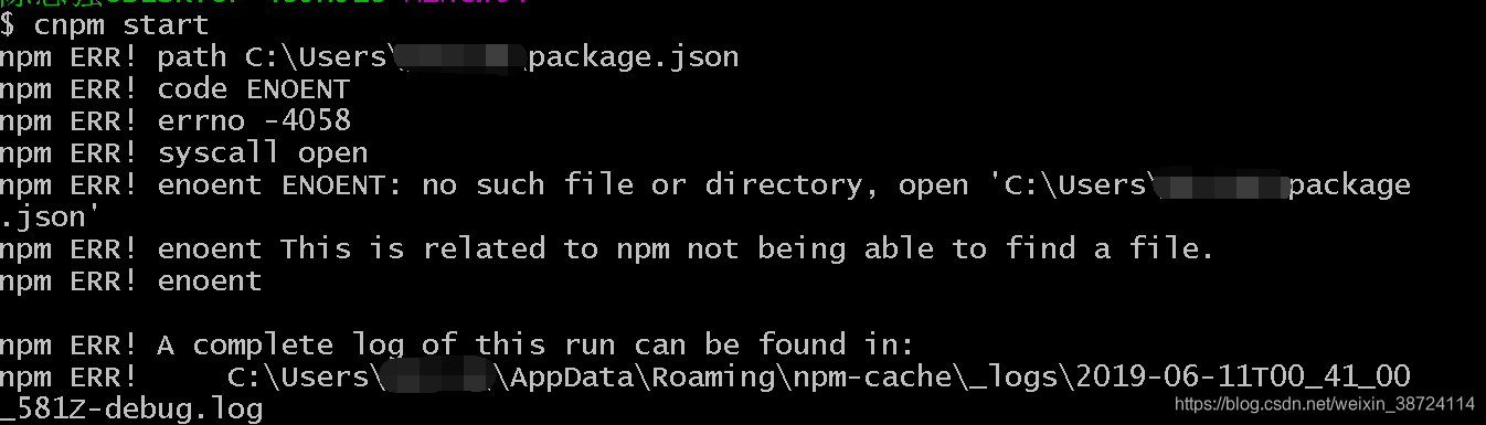 npm start报“npm ERR! enoent ENOENT: no such file or directory, open 'C:\Users\XXX\package.json'”