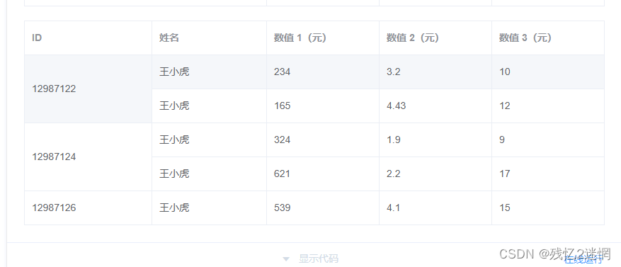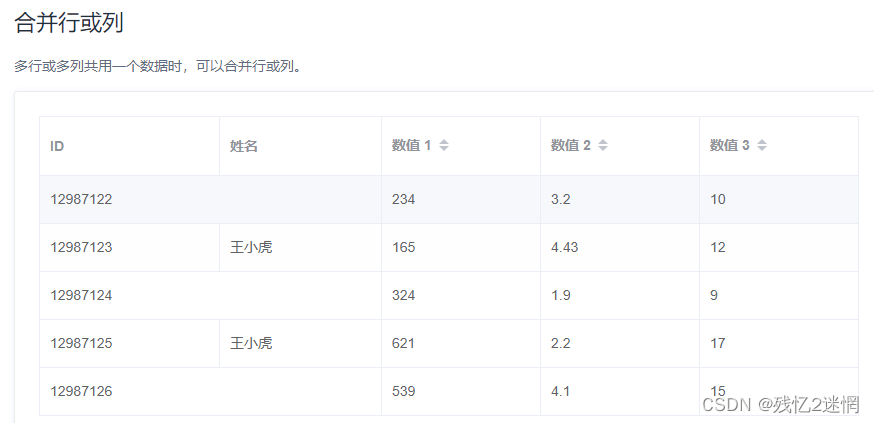 2.表格合并行和列注释 if (rowIndex % 2 === 0) { // 用于设置合并开始的行号
