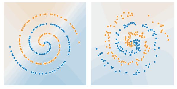 我们的目标就是通过神经网络将这两种数据分类,可以看出螺旋形态的数据分类是难度最高的。除此之外,PlayGround还提供了非常灵活的数据配置,可以调节噪声、训练数据和测试数据的比例和Batch size的大小。