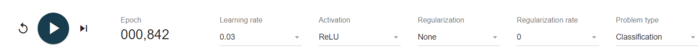 除了主要的四个部分外,在界面上还有一列控制神经网络的参数,从左到右分别是,训练的开关、迭代次数、学习速率、激活函数、正则化、正则化率和问题的类型。