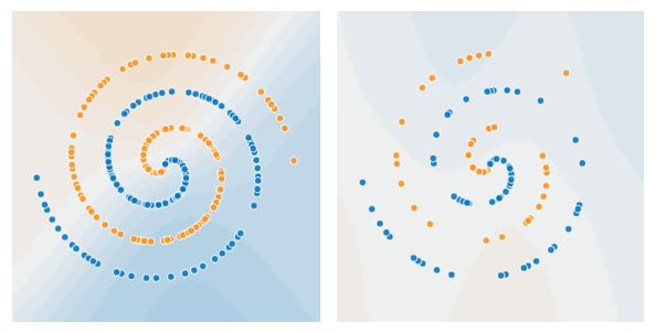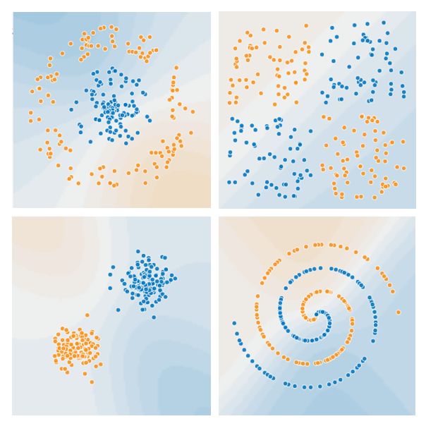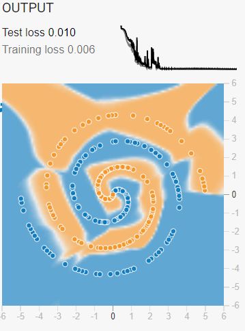 DATA一栏里提供了4种不同形态的数据,分别是圆形、异或、高斯和螺旋。平面内的数据分为蓝色和黄色两类。
