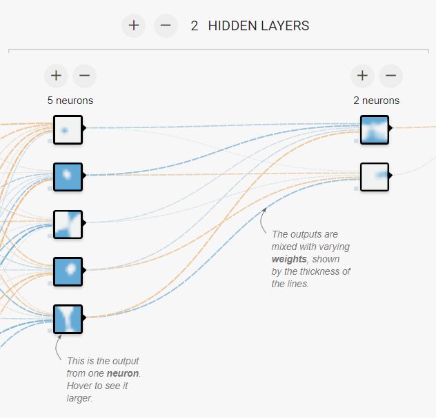 因为在这里是一个分类的问题,隐含层设置为两层,刚好对应输出的类型。层与层之间的连线粗细表示权重的绝对值大小,我们可以把鼠标放在线上查看权值,也可以点击修改。