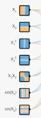 X1可以看成以横坐标分布的数据特征,X2是以纵坐标分布的数据特征,X1X1和X2X2是非负的抛物线分布,X1X2是双曲抛物面分布,sin(X1)和sin(X2)正弦分布。我们的目标就是通过这些特征的分布组合将两类数据(蓝色和黄色)区分开,这就是训练的目的。