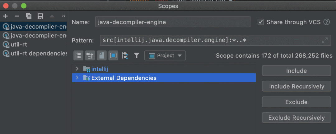 以后我们在搜索时,还可以添加外部的依赖到作用域中,完成更全面的搜索。设置入口在Preferences/Settings | Appearance & Behavior | Scopes