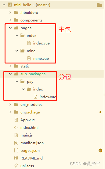 以下配置中,包含三个页面,分别是主包的首页、我的模块及分包的支付模块,目录结构如下图:
