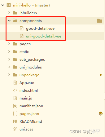 在components目录下创建两个vue组件,分别为good-detail.vue、uni-good-detail.vue,good-detail.vue组件将会通过import引用,而uni-good-detail.vue组件将会通过配置easycom后直接引用。目录结构及组件代码如下: