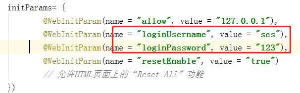 @WebInitParam(name = "loginUsername", value = "scs"),