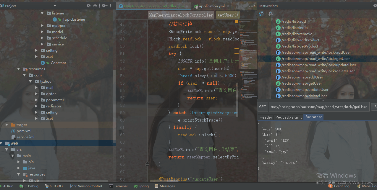 再看获取用户的接口代码。同样的,通过RMap#getLock获取一把相同的RLock 锁。调用RLock#lock方法,如果没有获取到锁,那么就会一直阻塞。当然了,这里有待商榷,在实际中可以使用Lock#tryLock防止获取锁时间过长而阻塞的问题。