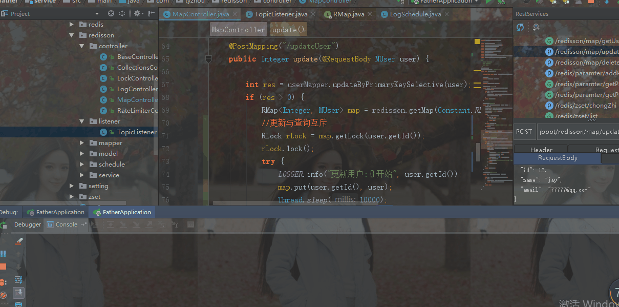 如下代码。只要调用RMap#getLock 方法就能获得一把 RLock锁。再看代码,在更新用户的操作上增加睡眠10秒钟,模拟更新业务的其他业务,例如消息推送、日志记录。最后就是使用finally语句释放锁。不用担心死锁问题,因为Redisson有"看门狗"机制,它在指定时间后会自动释放锁。