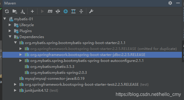 查看mybatis依赖包下的包,发现已经有spring-boot-starter-jdbc的包了。所以不需要再引入了。
