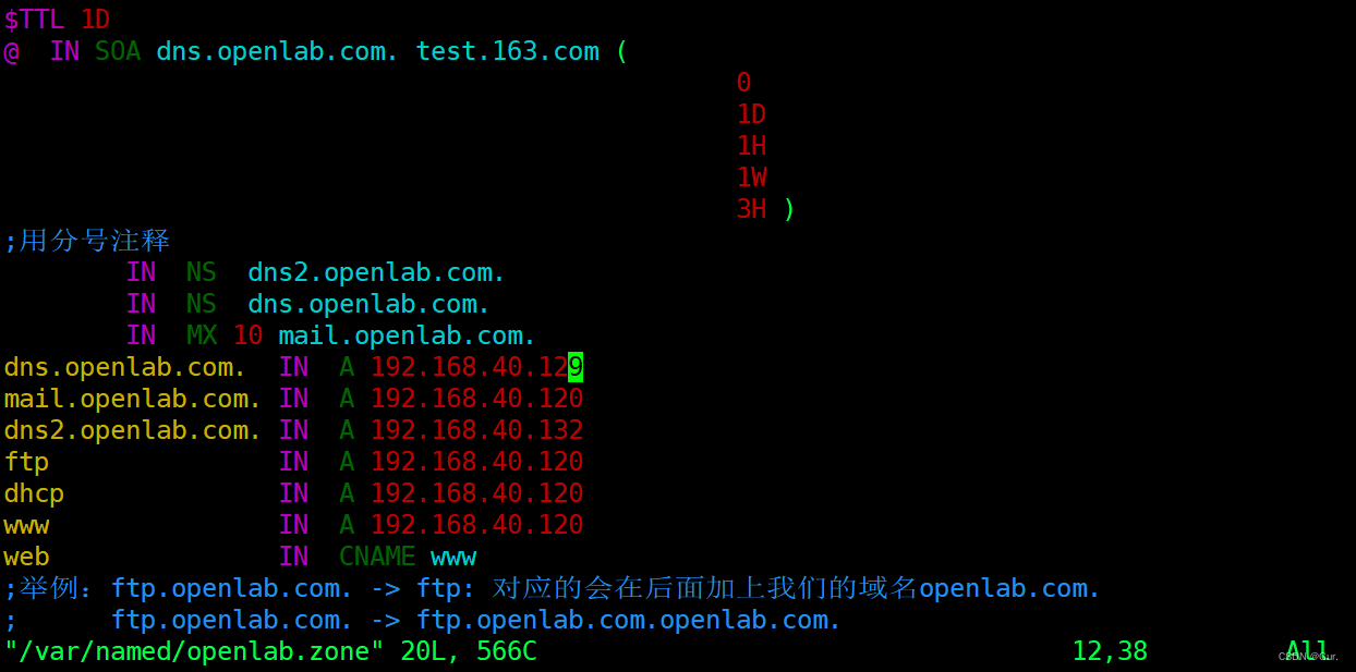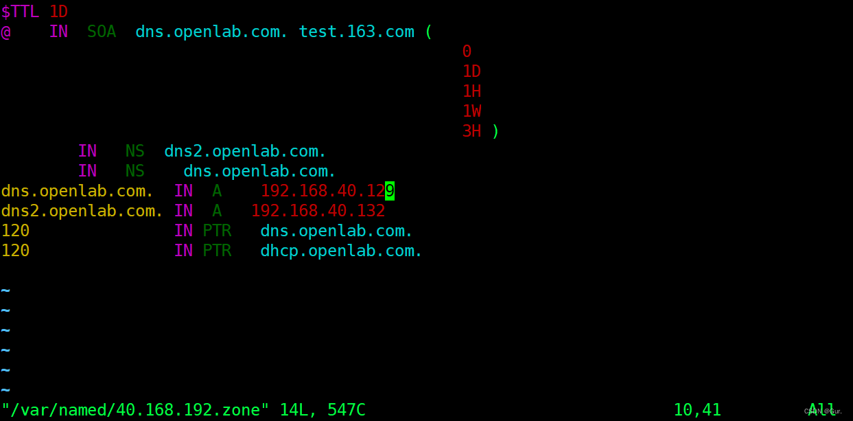 [root@rhcsa ~]# vim /var/named/openlab.zone