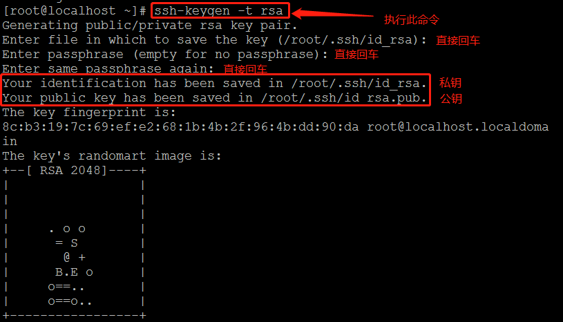 1、执行命令ssh-keygen -t rsa,生成公钥和私钥(具体步骤详见下图)