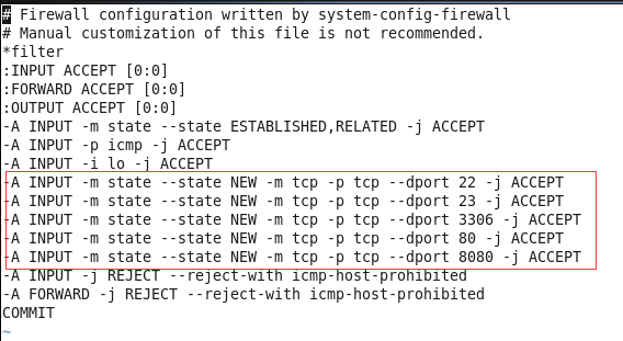 <span style="font-size:18px;">vi /etc/sysconfig/iptables</span>在该文件中添加一行:-A INPUT -m state --state NEW -m tcp -p tcp --dport 23 -j ACCEPT,如果你有其他端口也需要开放访问,可以一并开启,如果所示: