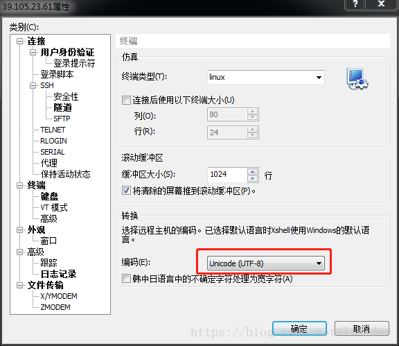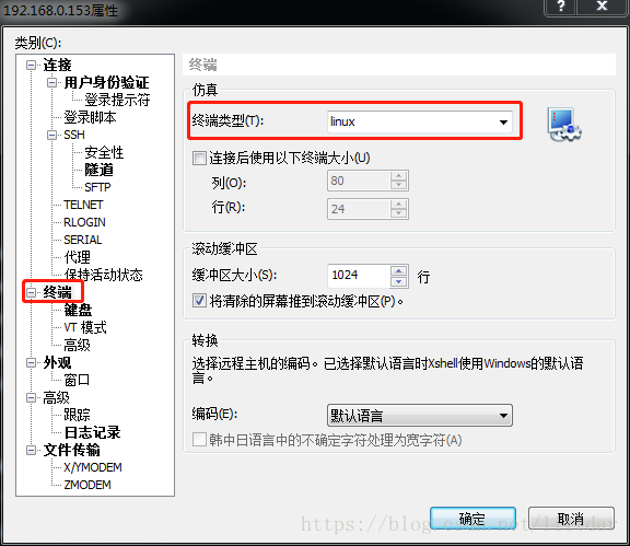 b)选择“属性”窗口左侧的“终端”标签,将“终端”标签对应的“终端类型”设置为“linux”,如下: