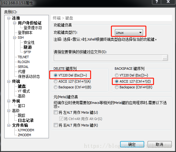 c)选择“属性”窗口左侧的“键盘”标签,将“键盘”标签对应的“功能键类型”设置为“linux”,“DELETE键序列”设置为“VT220 Del (Esc[3~])”,“BACKSPACE键序列”设置为“ASCII 127 (Ctrl+?)(I)”,如下图: