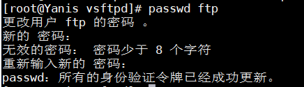 输入密码:ftp(密码太简单会要求确认输入,重新输入一遍即可,不过最好还是建议安装Linux密码规则设置复杂点的密码)