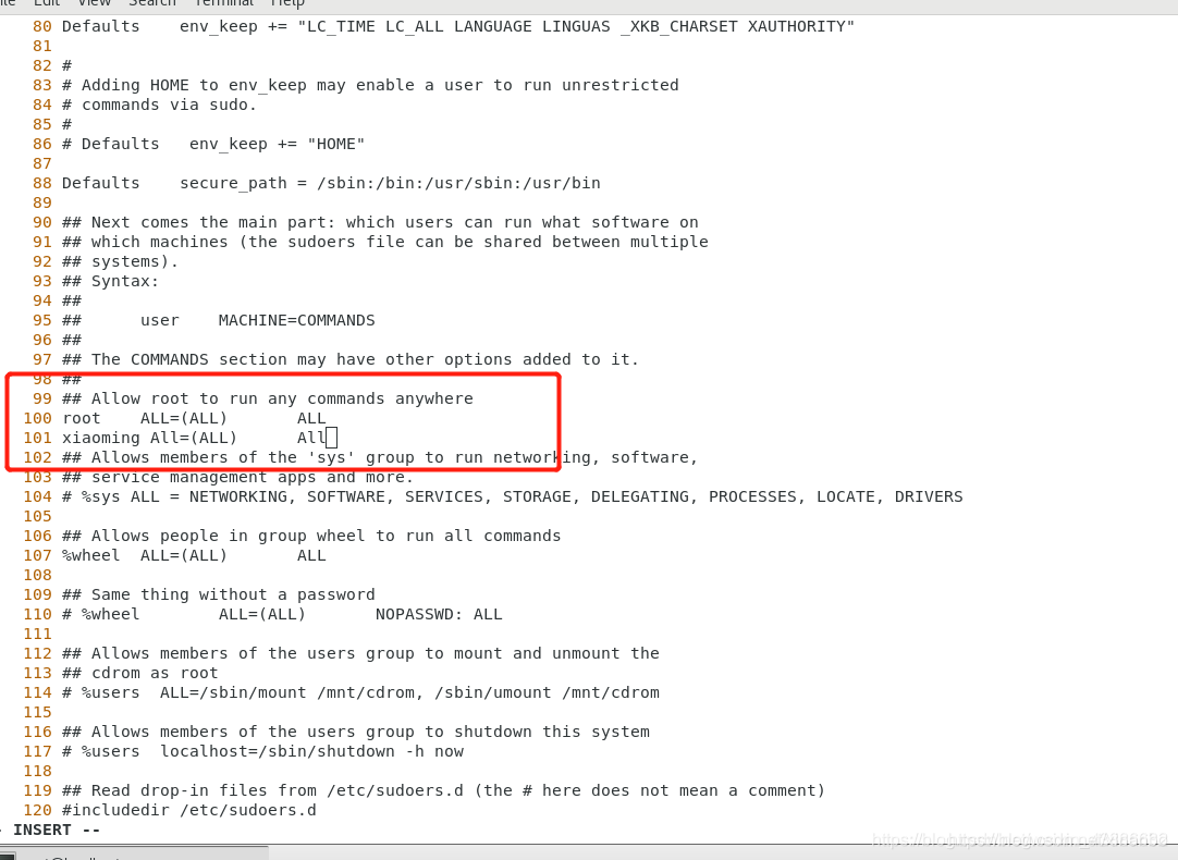 1、修改 /etc/sudoers 文件,找到107行,把前面的注释(#)去掉,如下图