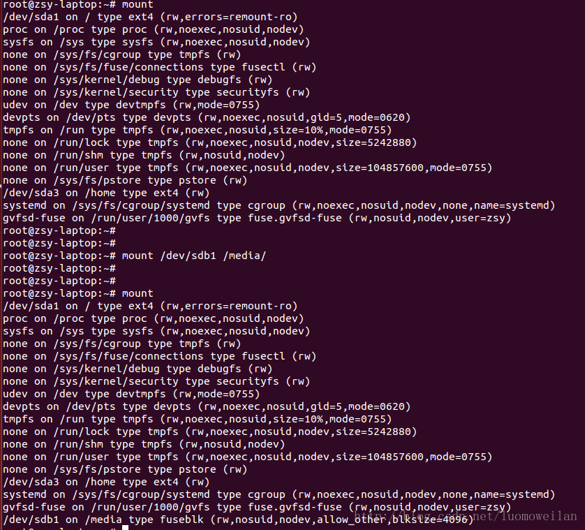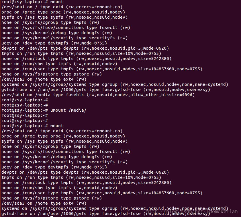 从图中可以看出,系统中已经挂载了/dev/sda1和/dev/sda3设备,同时还挂载了sysfs、proc、tmpfs等内存形式的文件系统;使用mount命令挂载移动硬盘设备/dev/sdb1到/media目录下。五、umount命令
