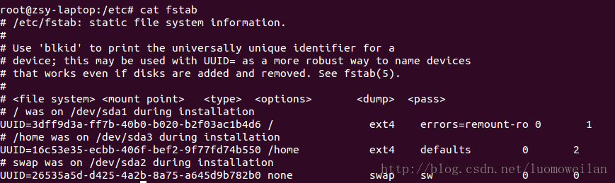 linux系统中的/etc/fstab配置文件记录了文件系统信息,linux在启动时挂载该文件中记录的所有文件系统。在/etc目录下还有一个叫做mtab的配置文件,该文件记录了系统中已经挂载的文件系统,注意该文件于fstab的区别。该文件一共包含6个字段信息,分别为:设备、挂载点、文件系统类型、挂载选项、备份频率、fsck检查顺序。