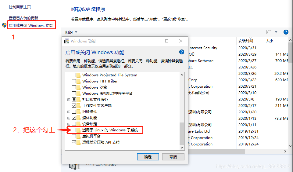 在“控制面板——程序——启用或关闭Windows功能”里,勾选“适用于Linux的Windows子系统”,勾选完成之后,需要重启系统才能生效。