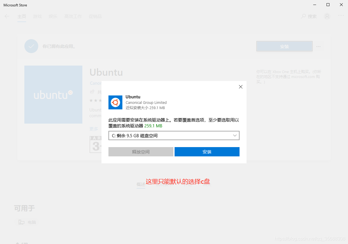 点击安装,会弹出一个驱动器选择对话框,但是只能选择c盘。