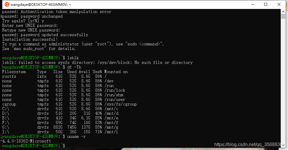 这之后的操作,就跟Ubuntu的操作一样了,但是我发现主机名和内核什么的,还是跟我Windows的系统一样,而且也可以看到其它def盘的内容。这个比较有意思。