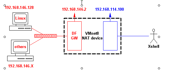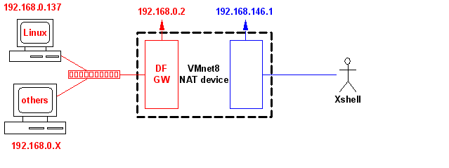 从网络拓扑图可以看出,当安装了Vmware软件后,实际上将在宿主系统中生成一个叫VMnet8的虚拟设备,该虚拟设备就是固定被分配作为NAT device来使用的,所以其上分配了2个固定的ip地址(可以配置修改为其他地址),其中192.168.146.2为内网所使用的网关ip,所有该宿主机上其他虚拟机都通过该网关和宿主机进行通信,也就是说共享192.168.114.100这个“对外”的公共地址,当然其实这个公共地址实际上就是仅宿主机可见。于是Xshell终端实际上就通过访问192.168.114.100,并且在DF gateway上通过端口映射后,即可使用ssh访问Linux,或者其他存在的主机,而上述方式可以在宿主机没有连上网络的情况下仍然有效