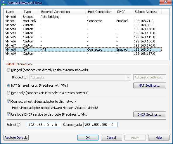注意事项:以上配置还需要在vmware下通过edit->virtual network setting菜单进行对应配置后才能生效,并且一定要注意如果发现宿主机中vmnet8的ip地址和nat设备的DF GW地址在一个网段,则必须重新单独将宿主的ip地址调整为另外一个网段后才能成功.