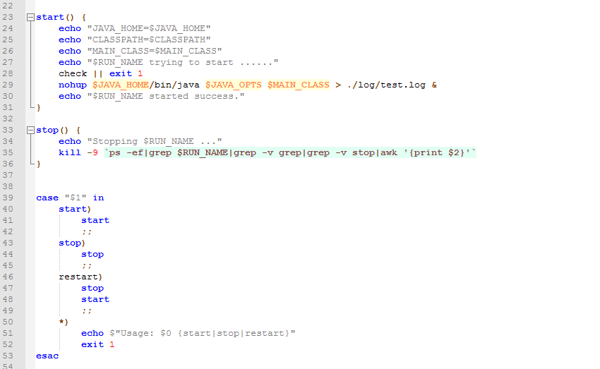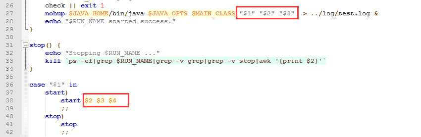 - 第23行的start和第33行的stop是启动函数,看后面的启动命令就知道了;