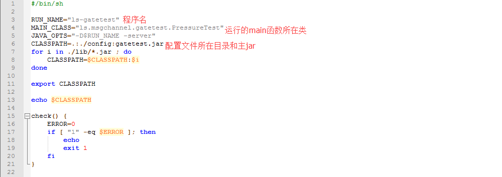 - 第6行中的"CLASSPATH=.:./config",这个是将你的配置文件路径告诉CLASSPATH,当然你可以随意修改后面的目录,这里默认放到了config下面;gatetest.jar是运行的主jar,当然可以在第7~9行做;