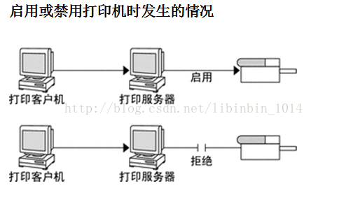 enable 和 disable 命令控制打印机打印还是停止打印打印队列中的请求。当您禁用打印机时,打印机将停止打印队列中的请求。但是,请求仍被添加到队列中。若不希望将请求添加到队列中,则必须将打印机设置为拒绝打印请求。