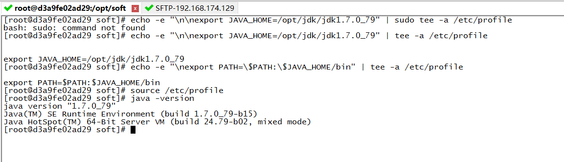 echo -e "\n\nexport JAVA_HOME=/opt/jdk/jdk1.7.0_79" | tee -a /etc/profile