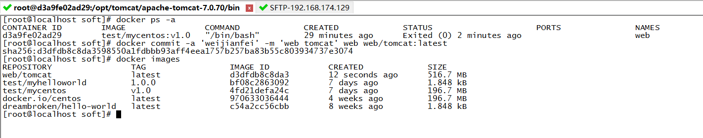 tomcat启动正常,但是该tomcat是在容器内部的,宿主机都无法访问(docker run 的时候没有指明容器哪个端口和宿主机哪个端口绑定)。现在退出容器,docker commit生成一个镜像,方便后面学习,避免每次都需搭建环境。