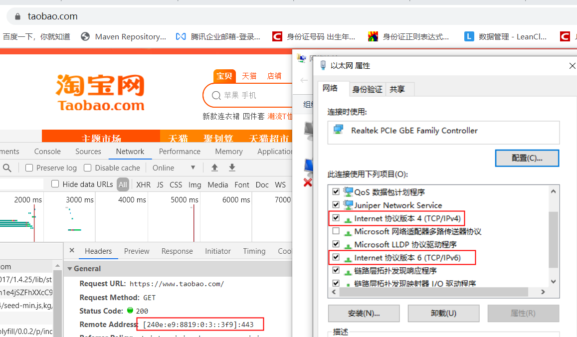 如果只勾选ipv4协议表示只通过ipv4协议访问不通过ipv6协议访问,发现淘宝的网站会解析到ipv4的地址上,样式也没有发生变化。