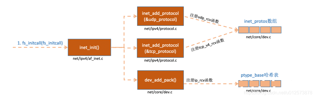 内核实现了网络层的ip协议,也实现了传输层的tcp协议和udp协议。这些协议对应的实现函数分别是ip_rcv(),tcp_v4_rcv()和udp_rcv()。和我们平时写代码的方式不一样的是,内核是通过注册的方式来实现的。Linux内核中的fs_initcall和subsys_initcall类似,也是初始化模块的入口。fs_initcall调用inet_init后开始网络协议栈注册。通过inet_init,将这些函数注册到了inet_protos(传输层协议)和ptype_base(网络/链路层协议)数据结构中了。如下图: