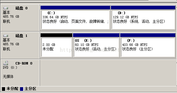 Windows系统可以再图形化界面看到分区,如图所示,本电脑有两块磁盘:磁盘0、磁盘1。磁盘0有2个主分区,对应盘符或路径为C:、D:;磁盘1有2个主分区,对应盘符或路径E:、F:,文件系统类型都为NFTS,其中有2G未分配分区。