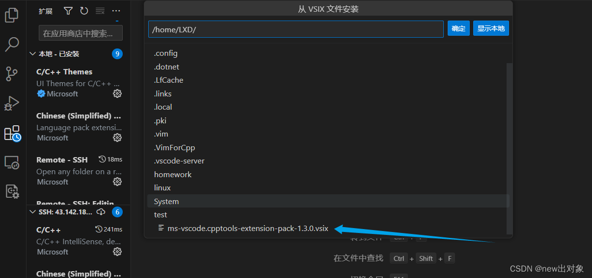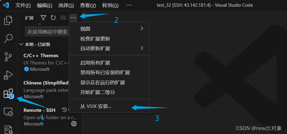 接下来打开VScode,登录上远程服务端,点击扩展,然后点插件列表右上角的三个小点... ,再选择从VSIX安装。