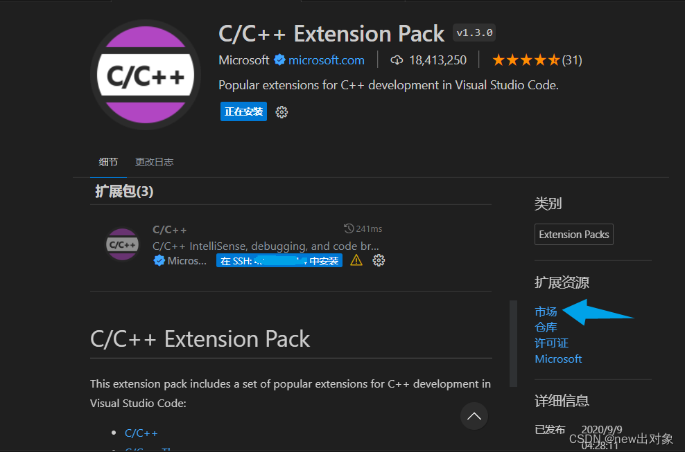 方法二:在VScode的插件下载页面点击市场,也可跳转。