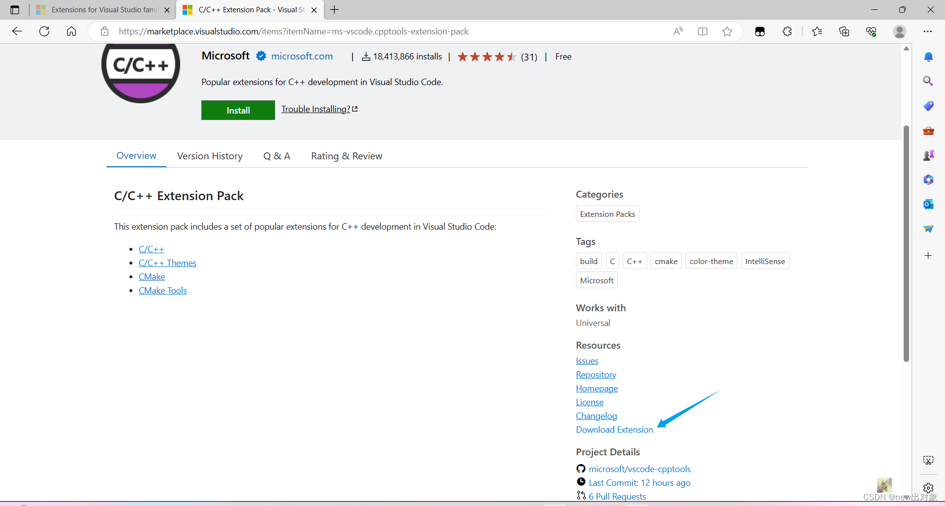 进入网页后,搜索要下载的插件,比如我要下载的C/C++ Extension Pack