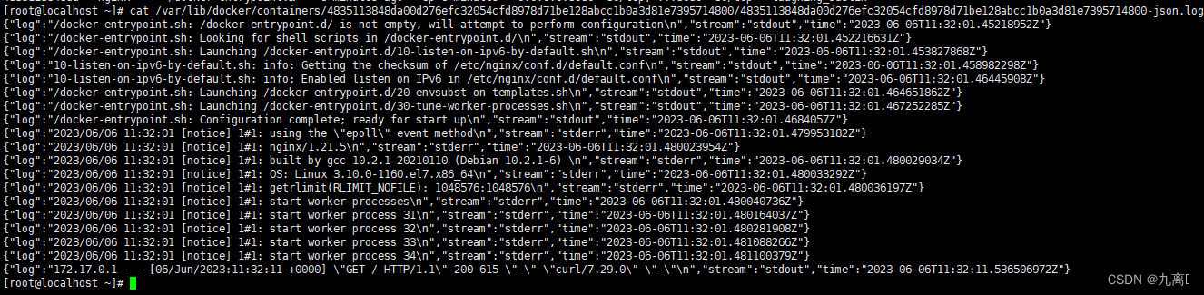 cat /var/lib/docker/containers/容器id/容器id-json.log