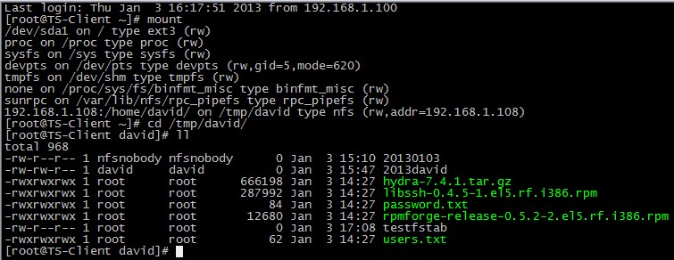 # mount 192.168.1.108:/home/david/ /tmp/david/