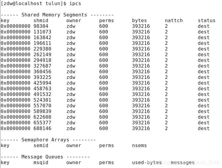 ipcs -s/-q/-m:分别显示系统的信号量 消息队列 共享内存