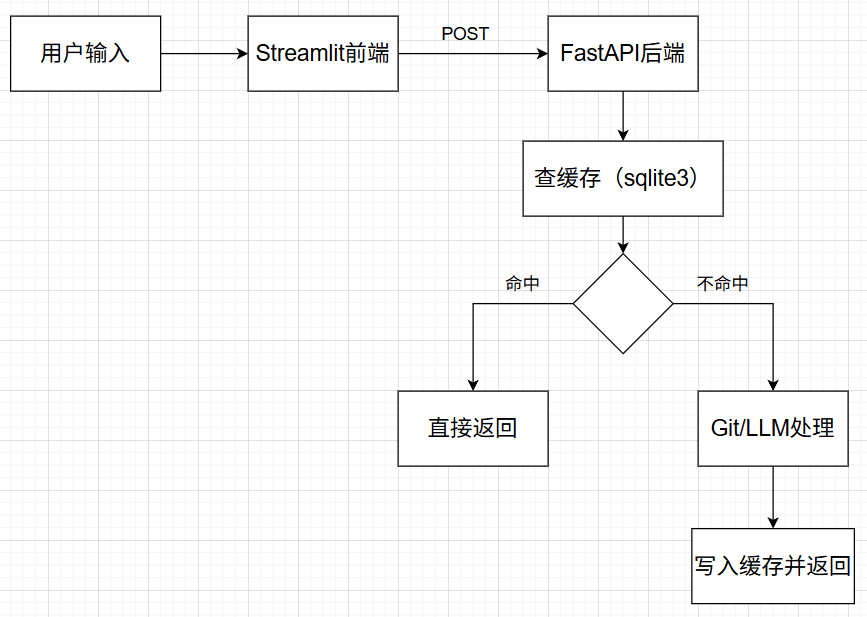 3.前端输入的tags,通过发送HTTP POST给FastAPI后端,后端这块先查询输入的tags是否已经存储在数据库中,如果有的话,直接返回结果,返回给前端显示结果;如果数据库没有的话,则调用Git API,获得两个tag之间的全部代码差异,并将差异导入给大语言模型,让其总结change scope,将tags和change scope存储到数据库中,并将结果返回到前端显示。
