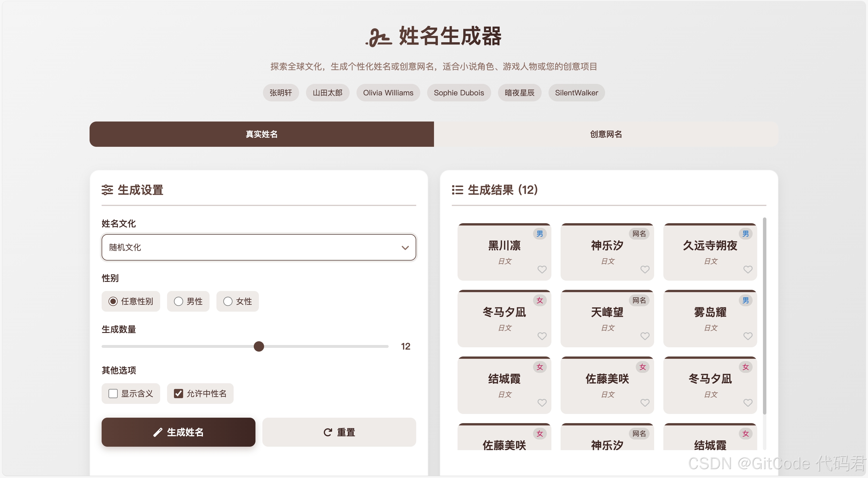 现在的姓名生成器已经能支持12种文化的姓名了。