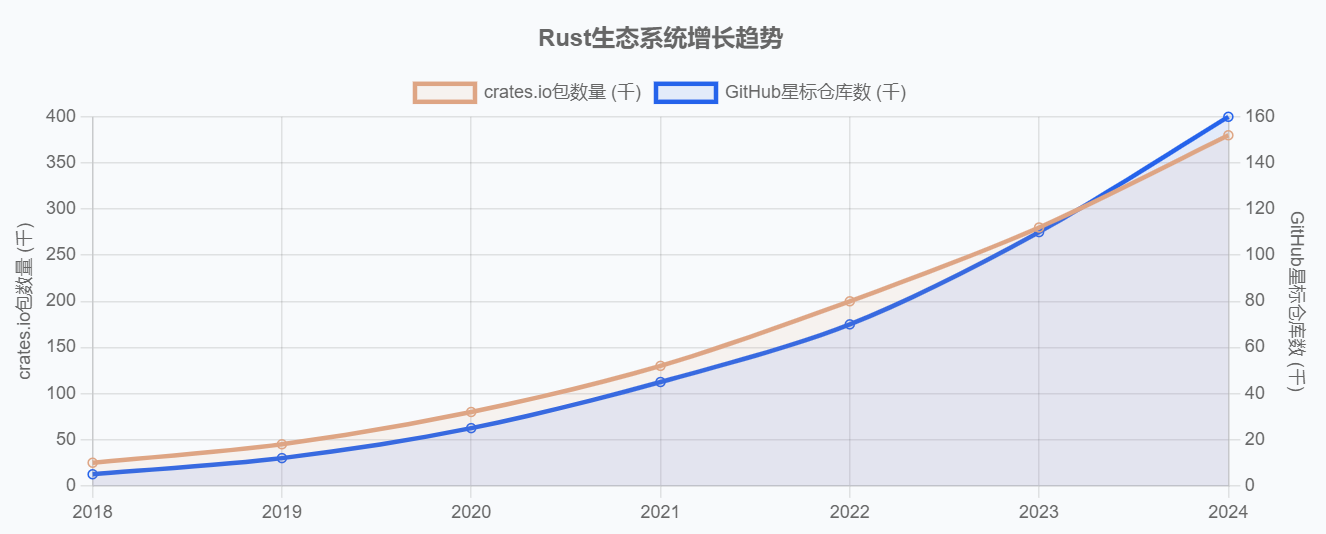 Rust生态正蓬勃生长,其发展趋势以GitHub上的星标仓库数量(单位:千)计算,如下所示: