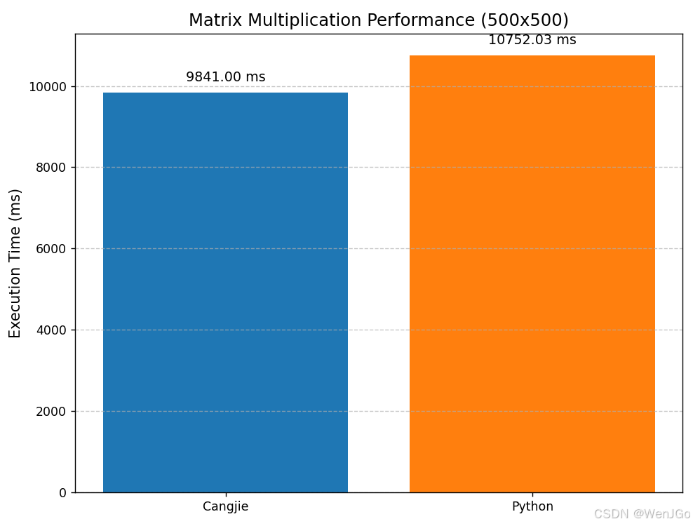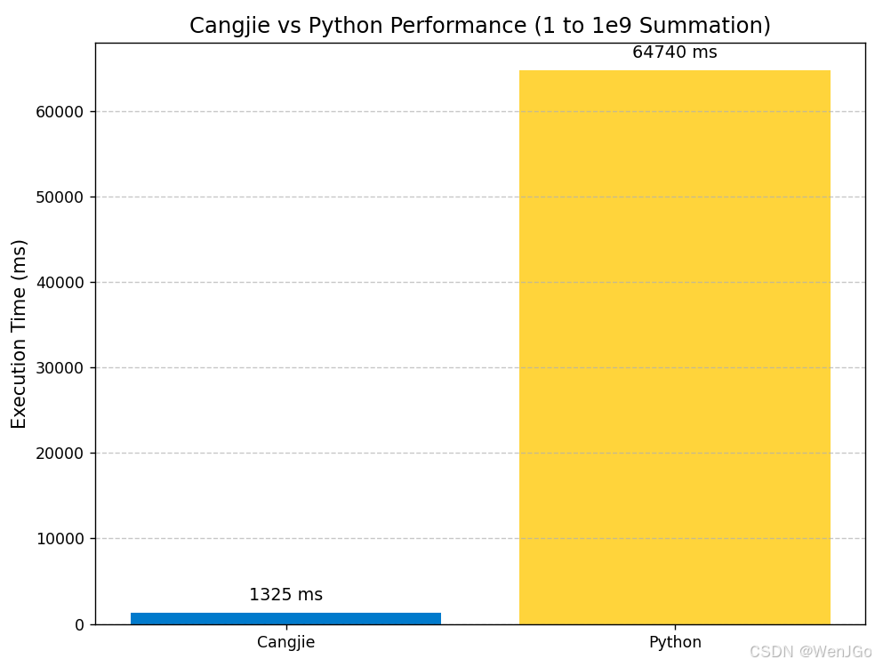 为了更直观地了解仓颉在计算场景下的性能表现,我以Python作为对比语言,围绕两个典型计算任务进行了性能测试:循环求和与矩阵运算。通过对比执行时间、资源占用及代码实现复杂度,分析仓颉语言在性能优化上的潜力与设计优势。