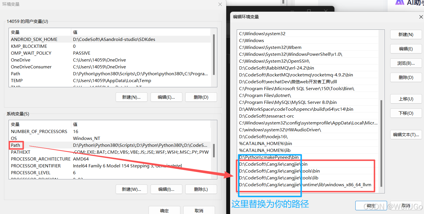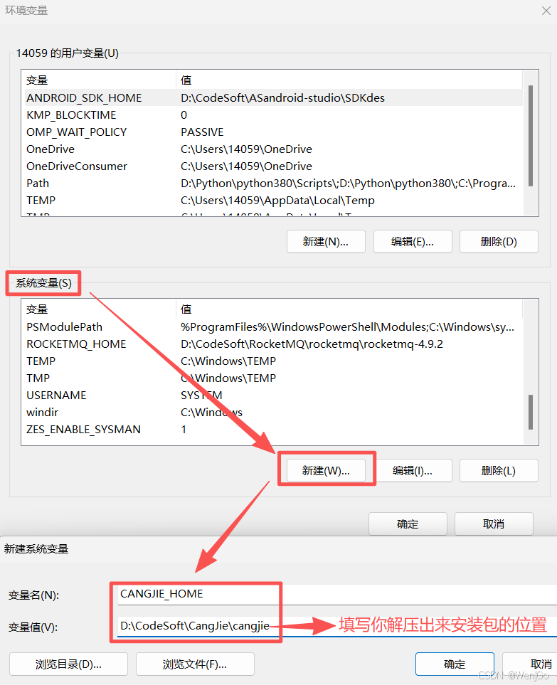 例如,仓库安装包解压在 D:\cangjie ,则新建的环境变量如下图所示: