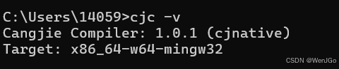 上述完成之后打开命令行发现版本正确,输出了仓颉编译器版本信息,表示已经成功安装了仓颉工具链。